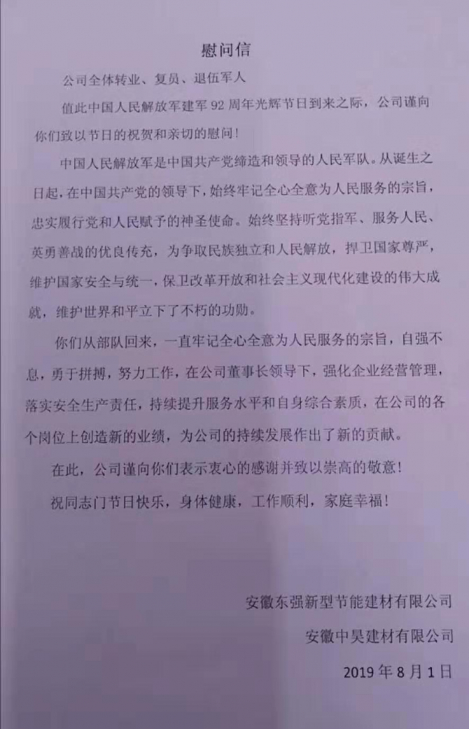 2019年8月1日迎來(lái)中國(guó)人民解放軍建軍92周年,公司全體領(lǐng)導(dǎo)、員工,向祖國(guó)最親愛(ài)的子弟兵致以衷心的祝福,同時(shí)向公司退伍軍人表達(dá)親切的慰問(wèn)。